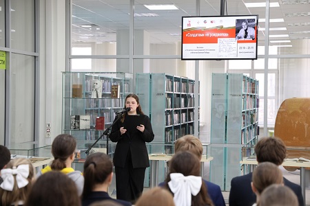 С приветственным словом к гостям обратилась заместитель директора библиотеки по социокультурной деятельности и связям с общественностью Юлия Александровна Косьяненко. Она отметила, что поэзия Константина Симонова не утратила своей актуальности в наши дни, а самое его знаменитое стихотворение «Жди меня, и я вернусь», написанное в 1941 году, вселяет веру и надежду в тех, кто сегодня ждет возвращения наших бойцов домой.
