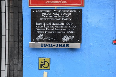 На доску занесены имена милославцев, вернувшихся с фронта и продолживших служить, охраняя покой и правопорядок в районе: Николая Пантелеевича Вилкова, Валентины Кузьминичны Козловой, Николая Борисовича Рябышкина, Константина Петровича Сорокина.