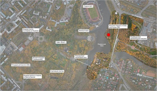 Место размещения монумента определено Концепцией благоустройства парка культуры отдыха «Рюмина Роща» и утверждено решением Художественного Совета города Рязани. Это территория, прилегающая к Голенчинскому шоссе и «Скорбященскому мемориальному комплексу». Территория парка будет соединена с территорией «Скорбященского мемориального комплекса» и станет продолжением большого пешеходного маршрута «Рязань пешеходная».