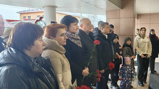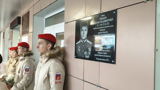 Право открыть мемориальную доску предоставили Михаилу Ромодину и сыну погибшего героя Ивану Ермакову. Участники митинга возложили цветы и почтили минутой молчания память всех погибших защитников Отечества.