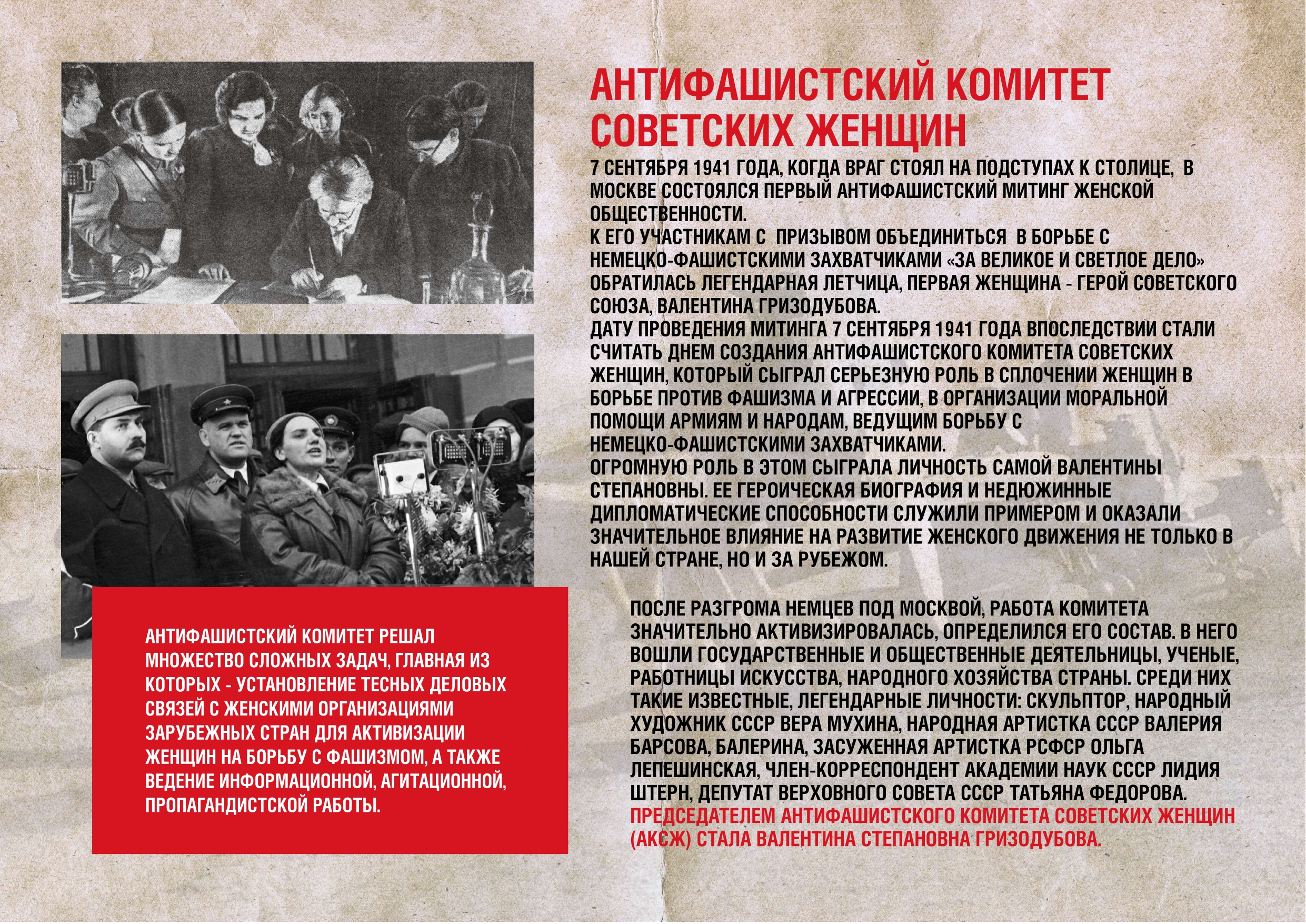 Общероссийской общественно-государственной организацией «Союз женщин России» подготовлены выставочные проекты, посвященные 85-летию со дня создания Антифашистского комитета советских женщин, 80-летию Победы и 115-летию со дня рождения Валентины Гризодубовой.
