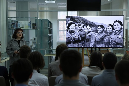 Ребята с особым вниманием слушали воспоминания участниц войны. Отрывки из документальных и художественных фильмов, архивные фотографии помогли им окунуться в атмосферу тех трагических дней, увидеть лица обыкновенных девчонок, ставших необыкновенными солдатами.